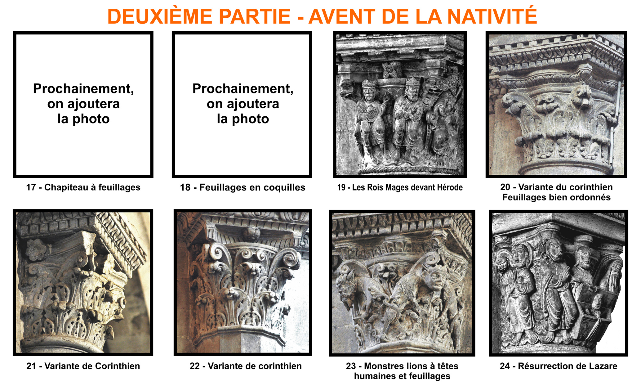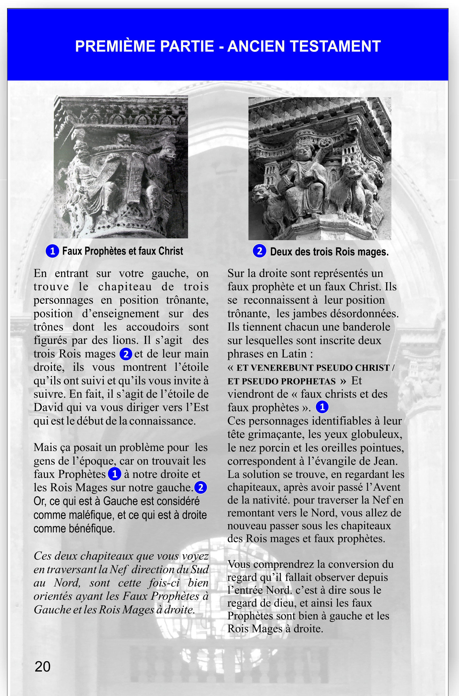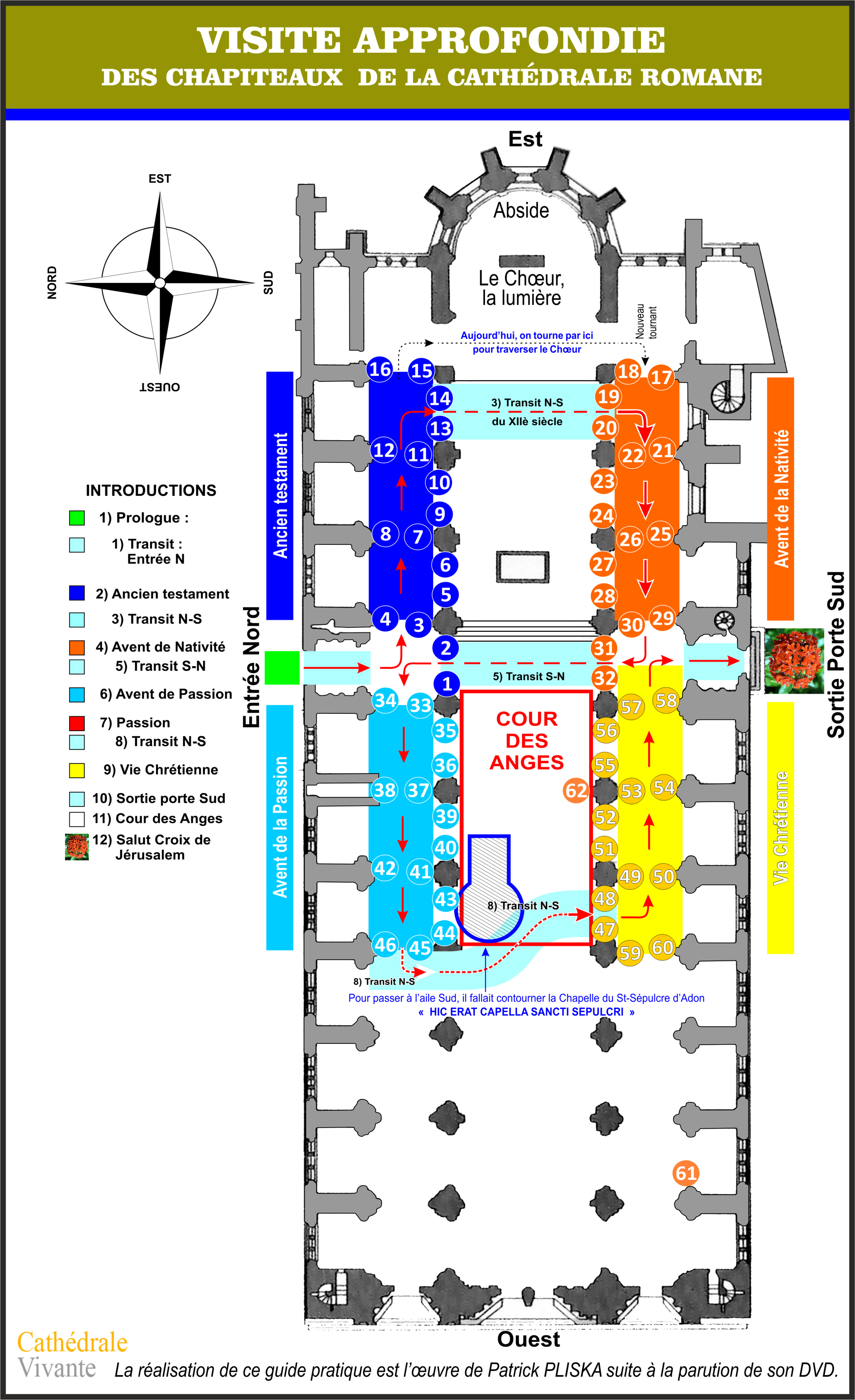 C'est ainsi que les fidèles au XIIe siècle avaient pour enseignement, l'Ancien Testament et l'évangile de Jean. Ils devaient suivre un parcours ordonné par les archevêques de l'époque pour rester sous les pas et le regard de Dieu. Les fidèles ne sachant ni lire, ni écrire suivaient ce parcours comme une bande dessinée, afin d’exercer leur culte religieux. Voici le parcours logique et chronologique des chapiteaux romans, tel que Patrick PLISKA l'avait décrit. Prochainement, suite à son DVD de 2015, un guide pratique, sera édité par Patrick PLISKA de l'association "Cathédrale Vivante".