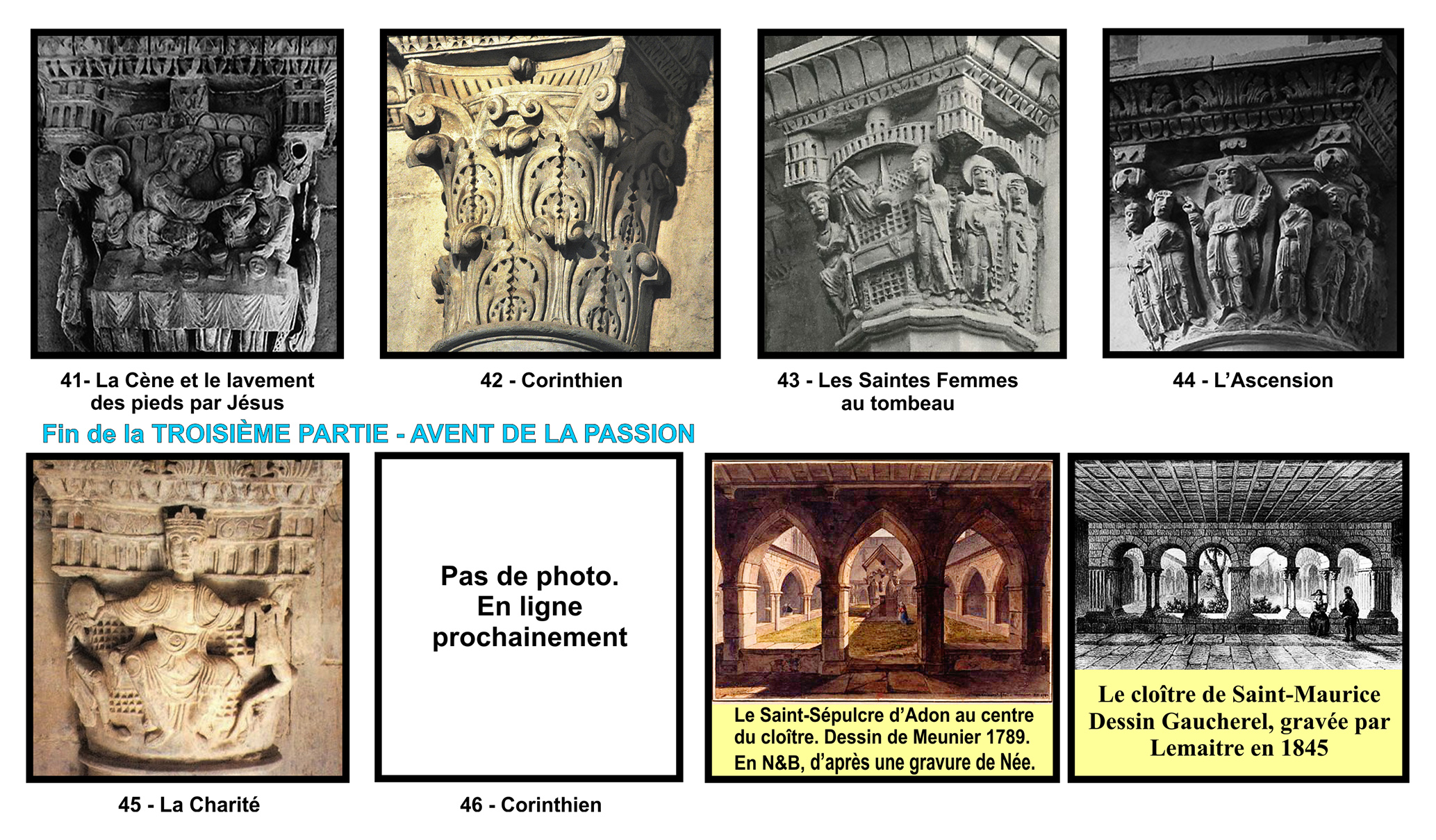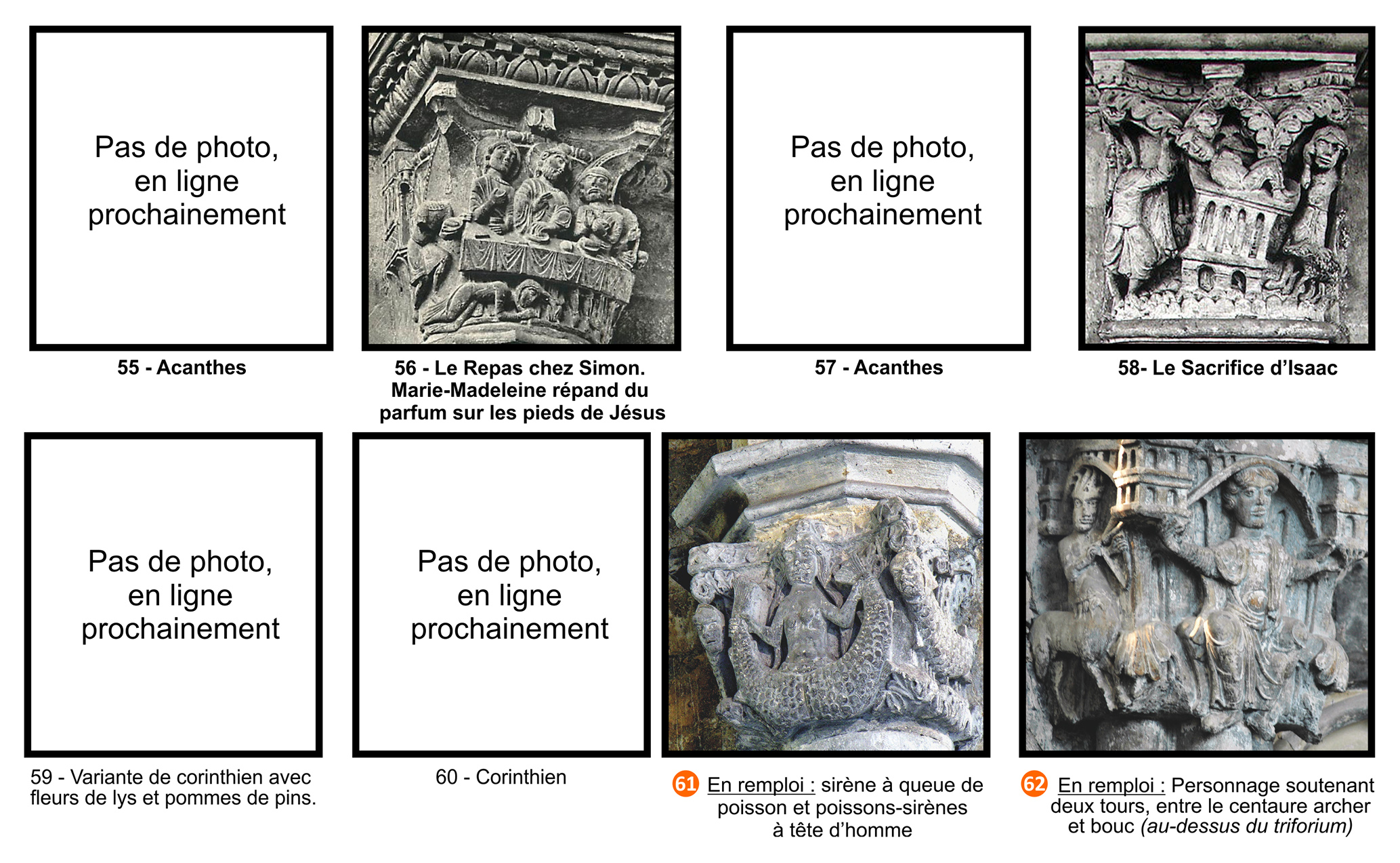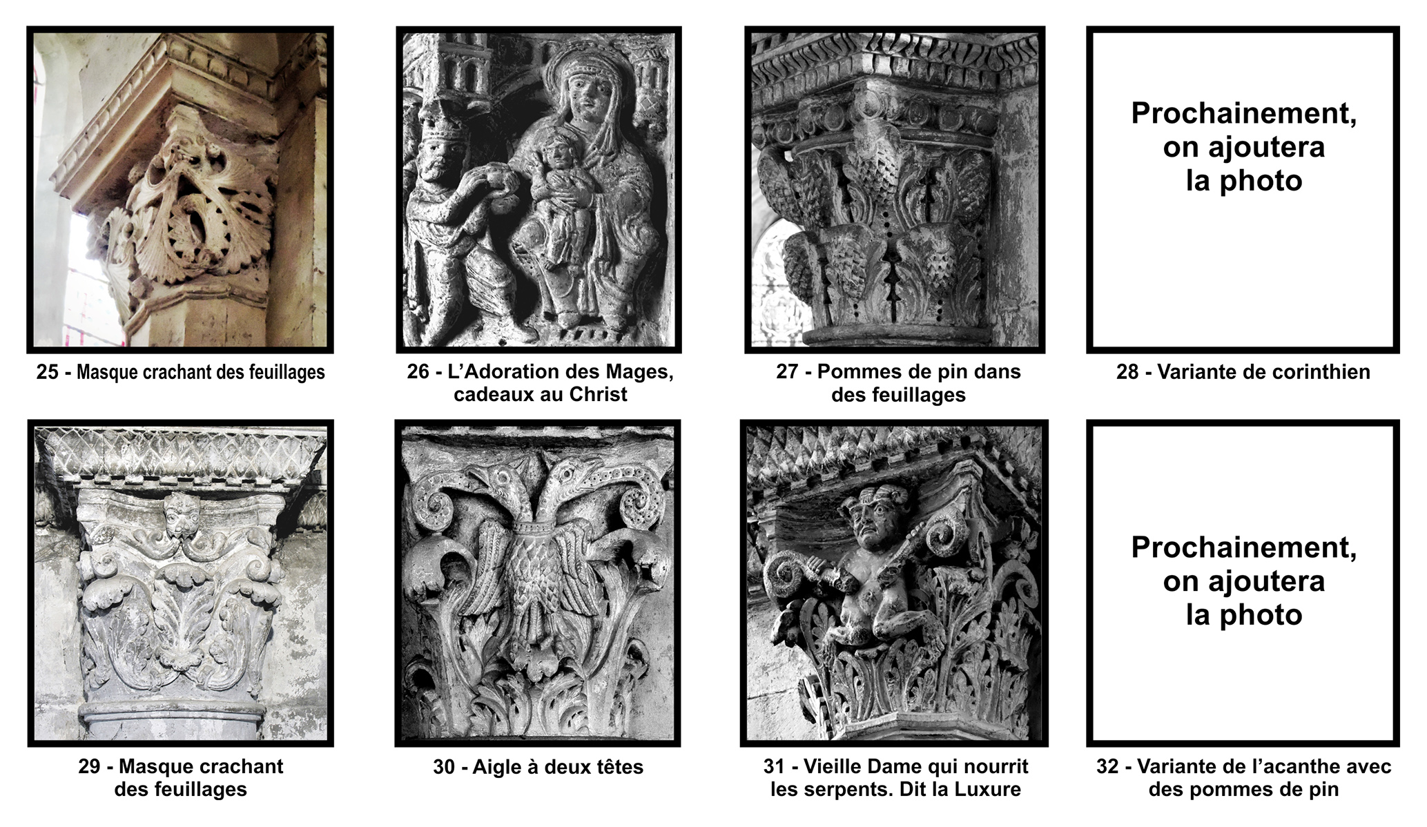 D’une série de 60 chapiteaux (avec des traces de polychromie) répartis dans les trois nefs romanes se dégage la série cohérente qui illustre le cycle pascal, regroupée intentionnellement au voisinage de la chapelle du Saint-Sépulcre :