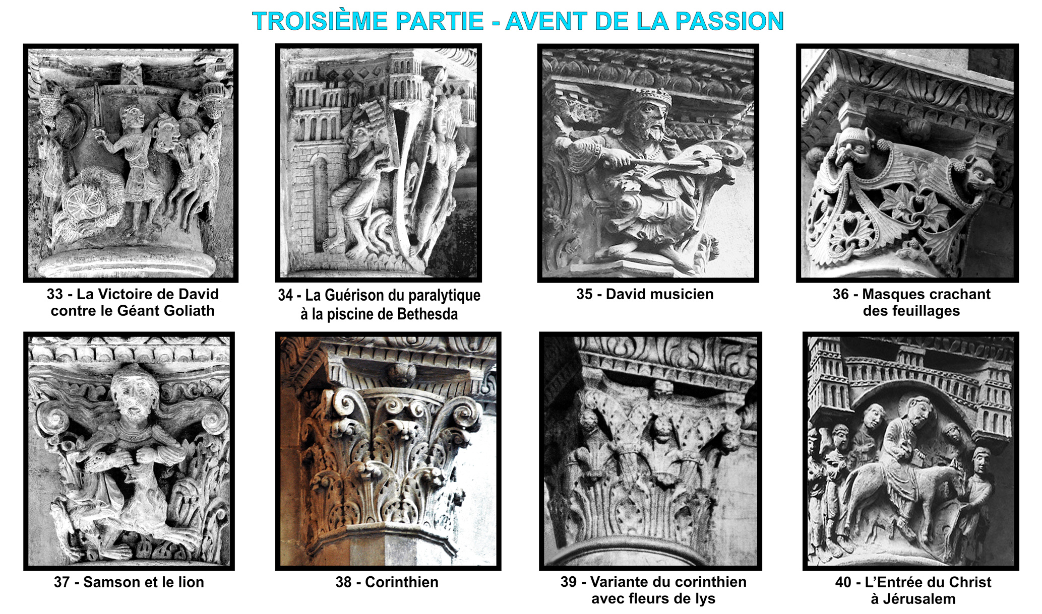 D’autres chapiteaux, dont les emplacements n’ont à première vue rien de logique ni d’ordonné, peuvent être associés à la thématique du Sauveur, à celle de la Rédemption, à celle de la Royauté du Christ ; l’Adoration des Mages, la Résurrection de Lazare ; l’Agneau entouré du bœuf (s. Luc) et du lion (s. Marc) est inspiré de l’Apocalypse ; des épisodes de l’Ancien Testament, tels l’Expulsion d’Adam et Eve du paradis (réparée par la résurrection du Christ), le Roi David (ancêtre du Christ), comme musicien et psalmiste, la Victoire de David sur Goliath, Sanson et le lion,..